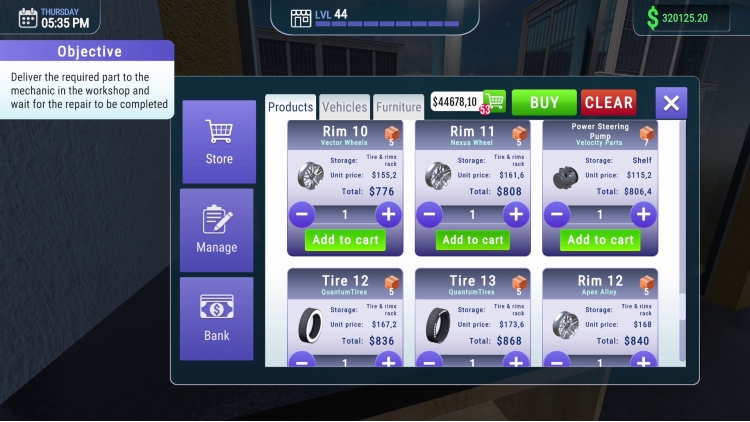 Enhance your inventory management skills by handling a wide range of car parts, including alternators, clutch kits, radiators, exhaust systems, and advanced electronic systems essential for modern vehicles. Learn to master the art of inventory control, optimize pricing strategies, and respond to market demand. Watch as your auto shop becomes a local industry leader known for efficiency and reliability.