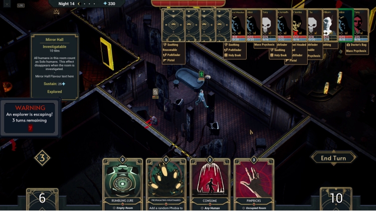 في النهار، صمم بدقة متاهة قصرك، محوّلاً إياه إلى فخ موت لا يستطيع أي إنسان الهروب منه. مع حلول الليل، اجذب المستكشفين غير المدركين إلى منزلك، حيث ستستخدم مجموعة من أوراق اللعب المرعبة لاستدعاء الأرواح، وتغيير الممرات، وإطلاق العنان لأهوال مرعبة. أشعل التوتر ودفع ضيوفك نحو الجنون، كل ذلك مع حماية غرفة قلبك - جوهر قوتك الشريرة.