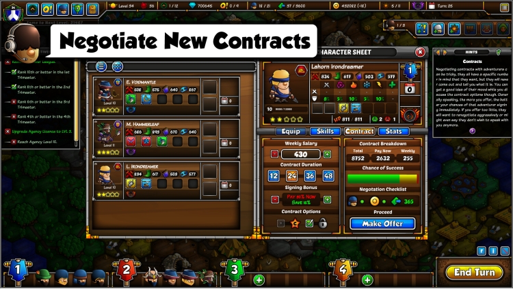 المغامرون هم العمود الفقري لوكالتك. للعثور عليهم، ستحتاج أولًا إلى تنظيم حملات تجنيد في جميع أنحاء المملكة، ثم التفاوض على شروط العقود مع أولئك الذين يقدمون المواهب والسمات وإمكانات النمو المناسبة!