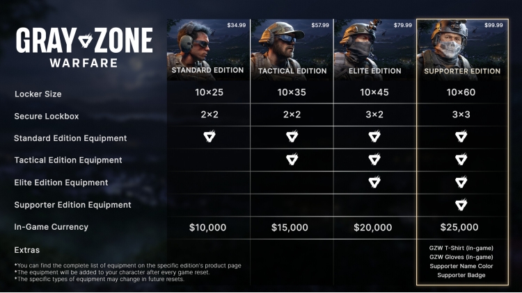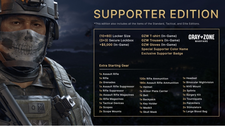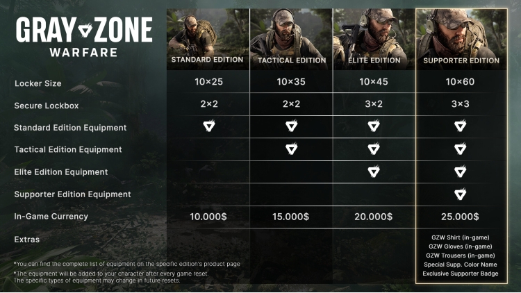 Immerse yourself in the ultimate Gray Zone Warfare experience with exclusive extras, including unique cosmetic apparel, a special supporter designation, additional supported equipment, the largest locker, and a lockbox.