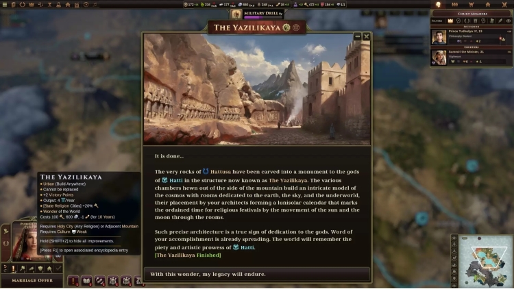 - حمورابي - يستبدل مهمة "المحكمة" بـ "محكمة الملك الإلهي"، مما يضاعف إنتاجها، ويضاعف فرص تجنيد رجال البلاط.
