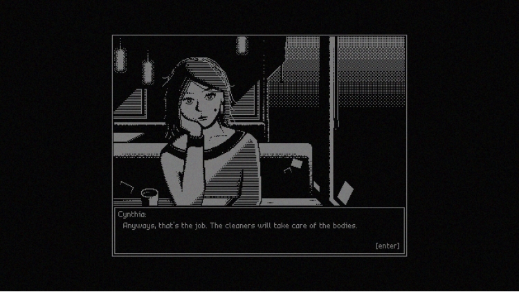 إنه يومك الأول في [الشركة]. كُلِّفتَ باستعادة خزانات الأكسجين التالفة المنتشرة في جميع أنحاء المنشأة. لا تسأل عن وظيفتها. لا تسأل من أين أتت. كان آرون يقوم بنفس المهمة. لا تسأل عنه. ركِّز على سينثيا: إنها لطيفة معك، أليس كذلك؟ ألا تهتم؟