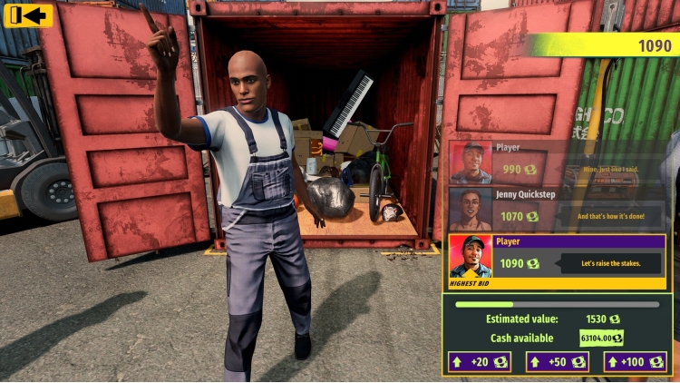 تأتي بضائعك من مصدر واحد: مزادات الحاويات المثيرة. كل صندوق معدني ضخم تم انتشاله من الأعماق، ويحمل في طياته إمكانيات هائلة. لديك 10 ثوانٍ فقط لإلقاء نظرة خاطفة وتقييم سريع، لذا عليك تحديد الكنوز الثمينة والخردة المخفية بسرعة. ستتنافس مع مجموعة من الشخصيات غير القابلة للعب، لكل منها شخصيته وأسلوبه الفريد في المزايدة. تعرّف على عاداتهم، وتوقّع تحركاتهم، واستخدم تكتيكات ذكية لضمان الحصول على أفضل صفقة بأقل سعر ممكن.