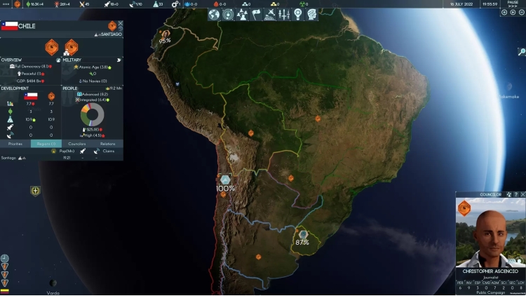 الجغرافيا السياسية هي صندوق الرمل الخاص بك - قم بتوحيد أو تفكيك الدول على النحو الذي يخدم غاياتك على أفضل وجه، بينما تستخدم الدول الخاضعة لنفوذك لشن حروب بالوكالة ضد الفصائل الستة الأخرى. يتم تصميم مناطق الأرض بالتفصيل، من المستويات التعليمية والاضطرابات إلى الناتج المحلي الإجمالي وعدم المساواة. إن اكتساب السيطرة على المناطق ذات الثروة النقدية الكبيرة والقوة العسكرية يمكن أن يسمح لك بتنفيذ إرادتك على الأرض، ولكن الحرب من أجل النظام الشمسي لن تفوز بدون تأمين المناطق التي تحتوي على مرافق الإطلاق الفضائية أيضًا.