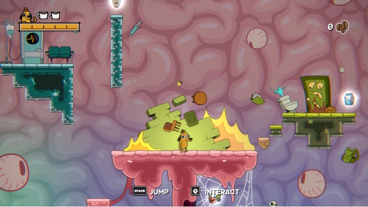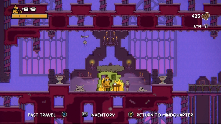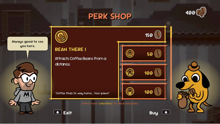 تأكد من التوقف عند كل نقطة استراحة مشتعلة لحفظ تقدمك، واحتساء قهوتك، والتظاهر بأن كل شيء على ما يرام للحظات. اجمع حبوب البن أثناء استكشافك؛ فهي عملتك التي تستخدمها لشراء مزايا إضافية وإعادة ملء كوب قهوتك العلاجية. كن متيقظًا في كل مكان تذهب إليه إذا كنت ترغب في العثور على كل عنصر مميز قابل للجمع!