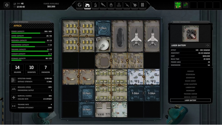 - A small radar station in Alaska detects an anomaly over the Bering Strait. Air Bases in Kamchatka and Yukon scramble jets to investigate, chasing multiple bogeys each, bringing them down over the water. Thousands of miles away, a radar station in Italy works in tandem with response teams stationed at a base in Algeria and an air base in France to take down alien operations on the Iberian Peninsula. Meanwhile, a new base is being built in Southeast Asia where the invaders have slipped through the cracks multiple times, inciting panic. Build, design, and manage multiple bases, each with its own squadrons of fighter jets and transports, radar arrays, research teams, operatives, and more. Consider the limitations of fuel ranges when you place them and use a grid-based construction system to optimally lay each of your bases out. Specialize your bases for detection, rapid response teams, research, manufacturing, and defenses as you see fit.